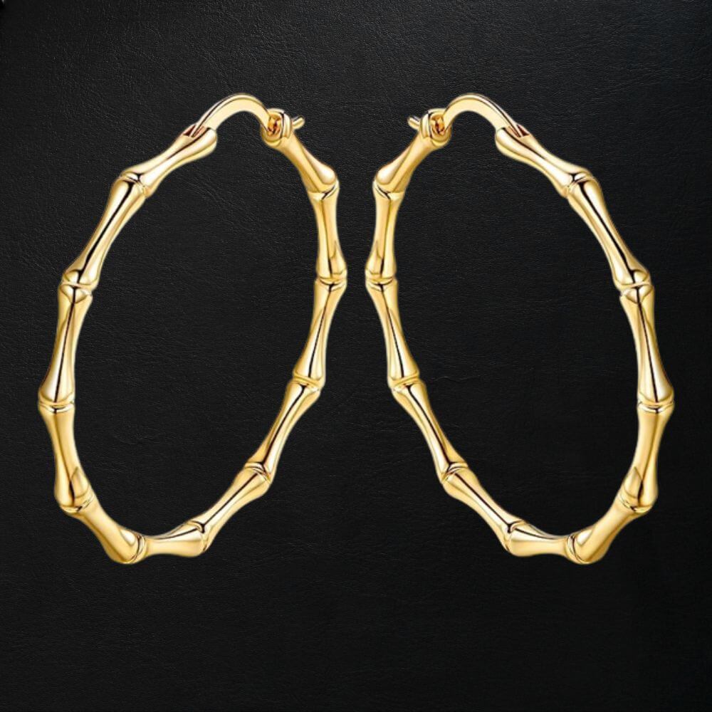 The Oivkilo Personalized Bamboo Gold Hoop Earrings are a stunning addition to any jewelry collection. Carefully crafted by skilled professionals, these earrings are made of 18K real gold plated stainless steel, ensuring that they are not only fashionable, but also corrosion-free, nickel-free, and lead-free, for those with sensitive skin.