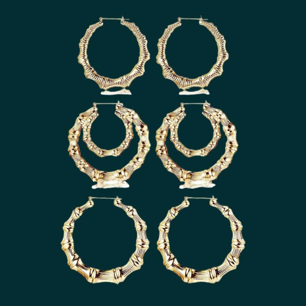 Glam up your look with Udalyn's 4 Pairs Bamboo Hoop Earrings! These large and stylish earrings are the perfect addition to any outfit looking for a subtle yet eye-catching twist. Whether you're out on the town, headed to work, or attending a fancy event, these gold-plated bamboo earrings have got you covered.