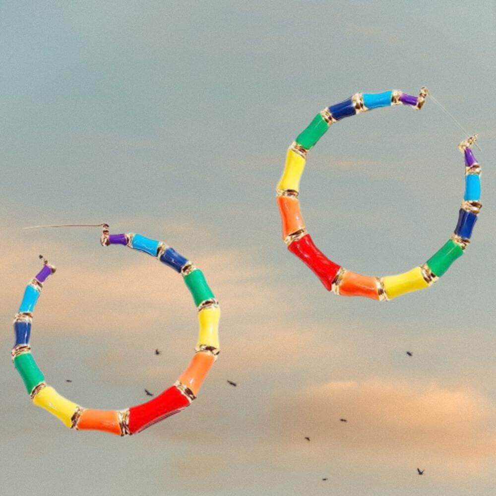 It’s time to add a rainbow of happiness to your wardrobe with the Rainbow Bamboo Hoop Earrings Statement! These lightweight earrings make a statement while remaining comfortable and durable enough for everyday use.