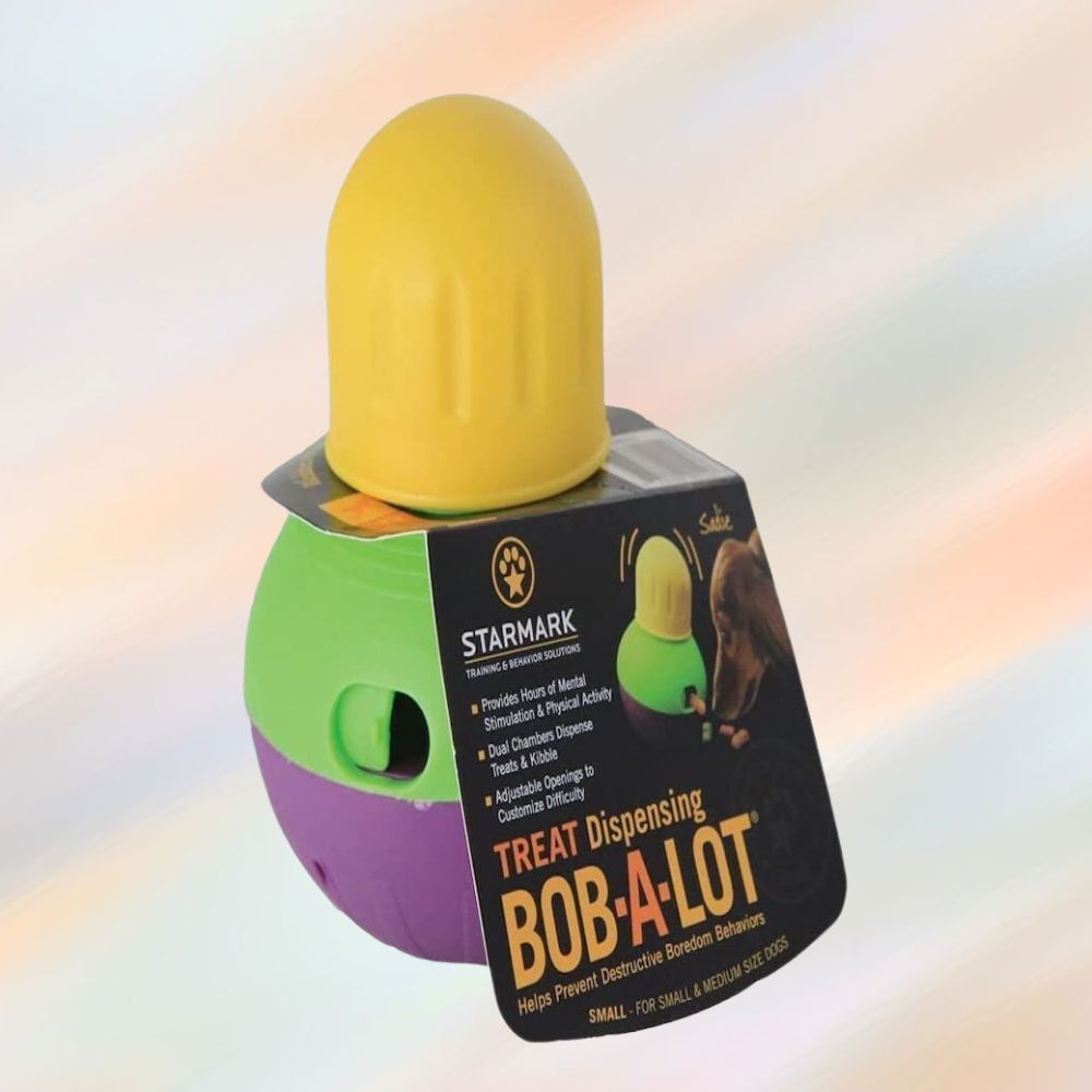 Constructed from durable plastic material, the Bob-a-Lot features a weighted bottom that causes it to wobble around as your pup paws and nudges it. And this cleverly designed toy has a new adjustment gate on its bottom which accommodates a larger kibble size as well as makes it easier to adjust. With its random treat dispensing process, you can even put treats in both slots at once—rewarding your dog each time they correctly solve the puzzle!