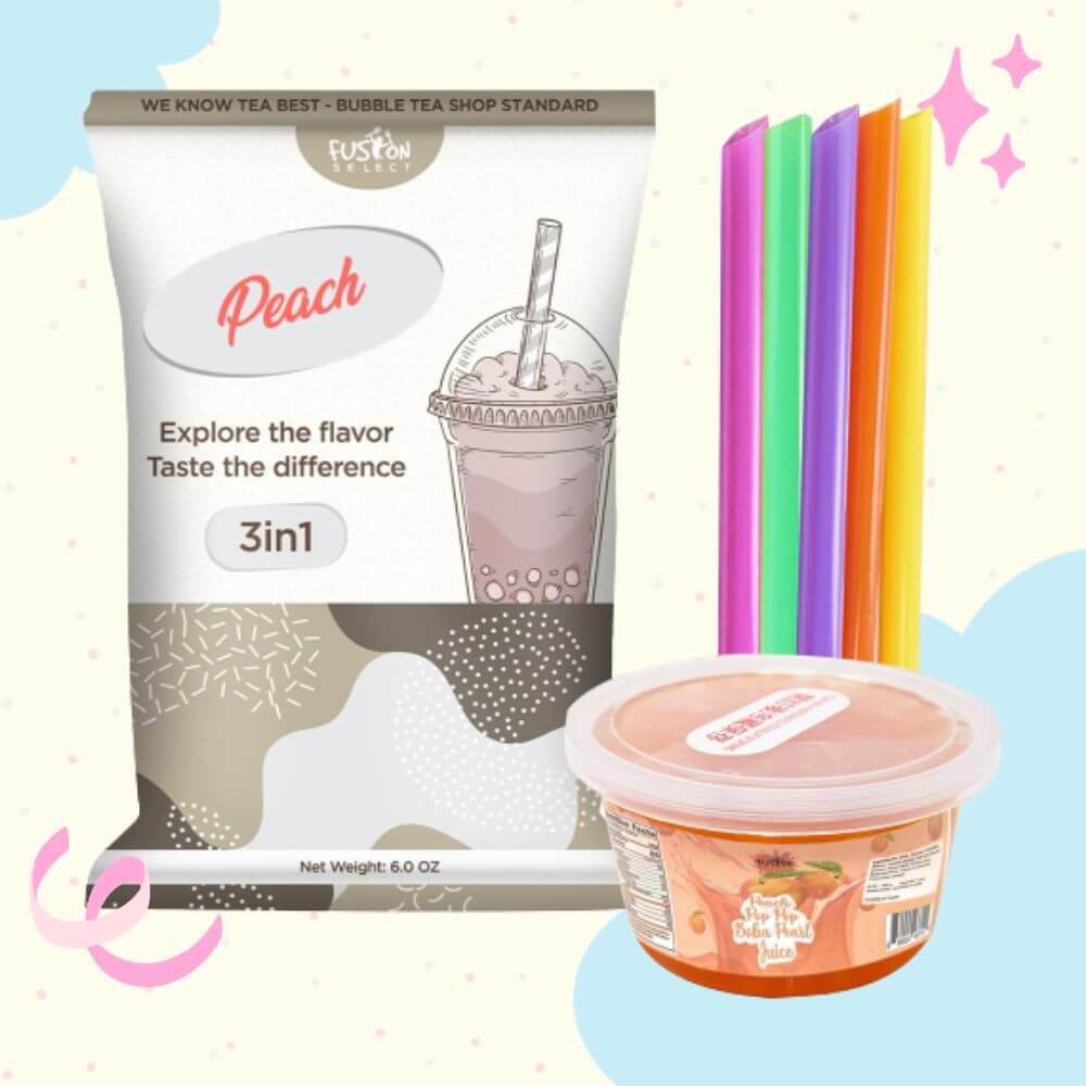 Have you ever wanted to enjoy a delicious and tantalizing bubble tea like the ones found at your favorite boba shop? Now you can with the Fusion Select Ultimate Peach Bubble Tea DIY Kit! This kit comes complete with everything you need to make an amazing fusion beverage — 3-in-1 powder, flavored bursting boba, and five large straws to drink it all up.